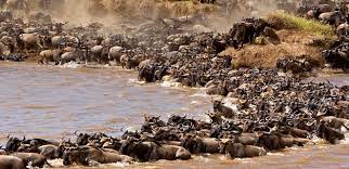 Each year, far south in the great vastness of the Serengeti, the wildebeest raise their dignified but quaint heads, sniff the air and, as if by one accord, start the long trek to the Kenya border and the Masai Mara. After exhausting the grazing in Tanzania’s northern Serengeti, a large number of wildebeest and zebra enter the Masai Mara National Reserve around the end of June drawn by the sweet grass raised by the long rains of April and May. It is estimated that more than half a million wildebeest enter the Masai Mara National Reserve and are joined by another 100,000 from the Loita Hills east of the Masai Mara. Driving in the midst of these great herds is an unimaginable experience. Whilst the eyes feast on the spectacle, the air carries the smells, the dust and the sounds of hundreds of thousands of animals. There is nowhere else on earth to compare with this wildlife marvel. But the trek is costly. The herds’ draw ravening packs of predators, especially hyenas and lions, and thousands of the lame, laggard and sick never complete the cycle. More die, by drowning or by the teeth of the cunning crocodile, while trying to cross the swirling muddy waters of the Mara and Talek rivers. Once the Masai Mara National Reserve’s grass has been devoured and when fresh rain in Tanzania has brought forth a new flush there, the herds turn south, heading hundreds of kilometers back to Serengeti and the Ngorongoro plains. There the young are dropped in time to grow sufficiently strong to undertake the long march north six months later.